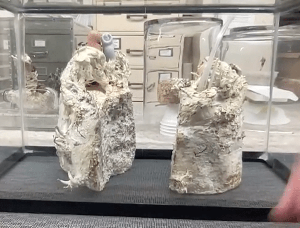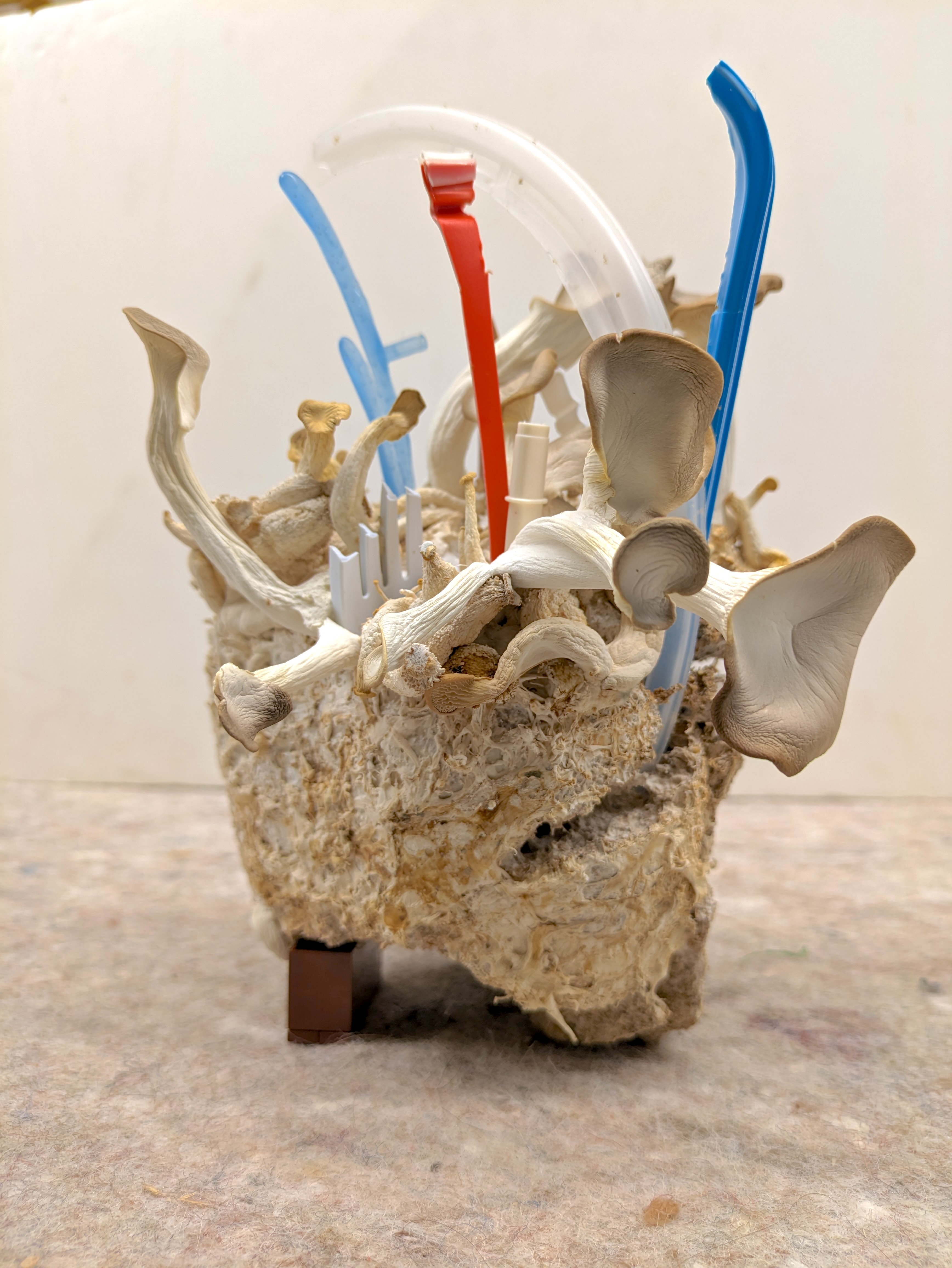 Pictured below is the plastomach installation at d’Expression and a series of plastic/fungi compositions currently on view at the Chrysler Herbarium.